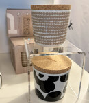 The ceramic candle holder has a cork lid and it features the Räsymatto pattern.