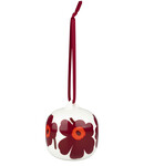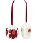 Both ornaments are decorated with the familiar Unikko flower pattern and have a beautiful red ribbon for hanging.